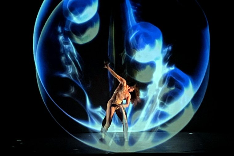 Al respecto, Jonathan Inostroza, jefe técnico de Nave, explica que las artistas “probaron con una malla holográfica, buscando generar un universo tridimensional, con cuerpos insertos en el espacio y experimentando el fenómeno de la luz con una tela holográfica”.