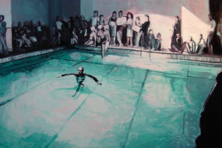 Detalle de óleo Enjuagues II (Washes, performance de Claes Oldenburg, 1965, Tulane Drama Review) 2012, de Natalia Babarovic.