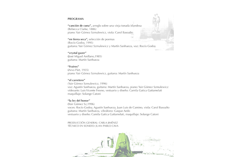 Se escucharán piezas de Rebecca Clarke, Arvo Pärt y José Miguel Arellano y, además, dos estrenos absolutos: En Tierra Seca de Rocío Godoy, y dos escenas de la ópera de cámara Inés, Oro en el Paisaje, de Yair Gómez Szmulewicz.