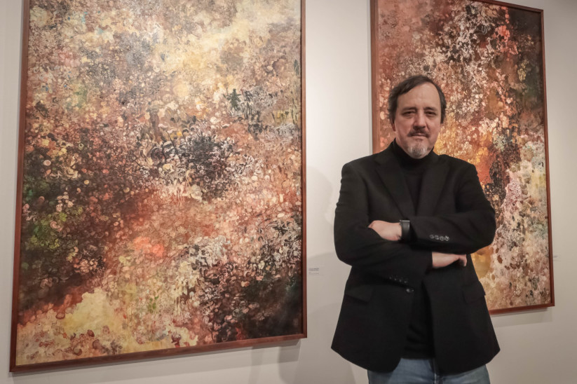 En "CÆLATURA", palabra que en latín remite al cincelado y también al cielo que recubre la tierra, la matriz se convierte en un cuerpo vivo trabajado mediante el agua fuerte (la mezcla de agua y ácido), el fuego y la fricción. Para el artista, el grabado es una forma de esculpir: cada plancha es tallada, marcada y finalmente revelada como un mapa simbólico donde conviven formas marinas, arquitecturas imaginarias, geografías andinas, visiones interiores y referencias literarias. La exposición funciona como un cierre simbólico del ciclo de treinta años dedicados al aguafuerte, pero también como un momento de síntesis que permite observar la evolución de una obra que ha transitado entre lo biológico, lo mítico y lo espiritual.