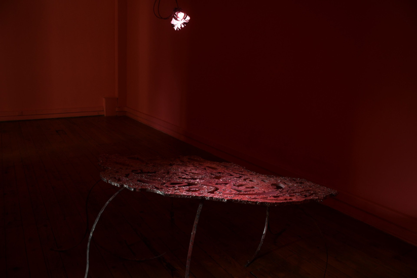 Es así como "Concha en ácido" se despliega con aproximaciones basadas en lo colectivo, en los materiales de desecho (conchas, patas de jaiba, cáscaras de erizo), en intervenciones en la arquitectura (del MAC), y en versiones expandidas de la escultura. Un rizoma de decisiones que nos puede remitir a un -restaurant- Food (Matta-Clark, 1971) rosado y ubicado en el litoral central, lleno de múltiples mesas escultóricas. Sin embargo, la propuesta de Elizabeth Burmann, más que sumar imágenes para la estetización del fondo marino, lo que busca es traer a la superficie lo que